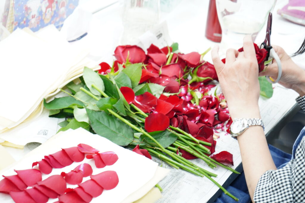 上野駅徒歩5分にあるアトリエにお花をお持ち込みいただくか、専用キットをお届けしますので、そちらに花束を入れてお送りください。